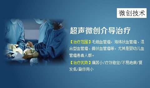 超声微创介导医治技术是在介入疗法和动静脉导管技术基础上发展起来的新技术,与其他技术相比,不产生射线,无放射性物质;不用激素、同位素及其化疗药物。此技术适宜各种海绵状血管瘤、肝血管瘤及淋巴性血管瘤患者,特别是对婴幼儿血管瘤的医治效果较好。